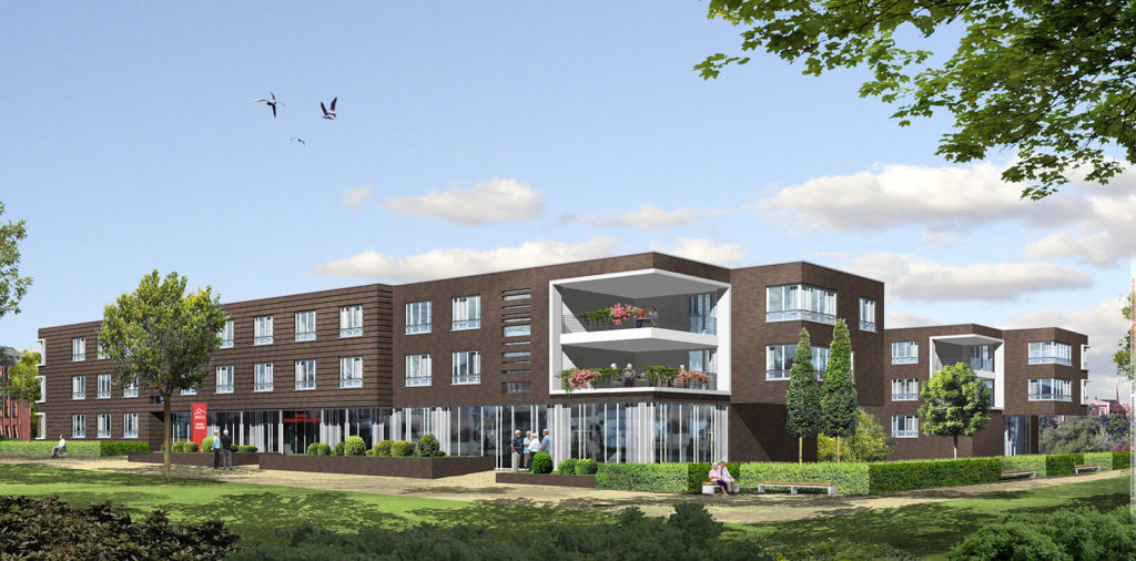 Im Stadtteil St. Lorenz errichtet die HBB ihr zweites Seniorenpflegeheim in der Hansestadt. Zwischen Bahnhof und Holstentor, oberhalb des Stadtgrabens und vis-á-vis der als Weltkulturerbe geschützten Altstadt, wird an der Konrad-Adenauer-Straße das neue Gebäude mit einer Bruttogeschossfläche von rund 9.300 m² entstehen. Mit Blick auf die markanten und unverwechselbaren Sieben Türme bietet die Seniorenimmobilie dann 160 Pflegeplätze für ihre zukünftigen BewohnerInnen. Klare Formen und viel Tageslicht sind die Hauptmerkmale des dreigeschossigen Gebäudes, das mit einer modernen, kubischen Architektur Zeichen setzt. Große Glasfronten mit dem Haupteingang auf der Südseite sowie große Fensterflächen auf der Ostseite in Richtung Stadt sorgen für spannende Ein- und Ausblicke.